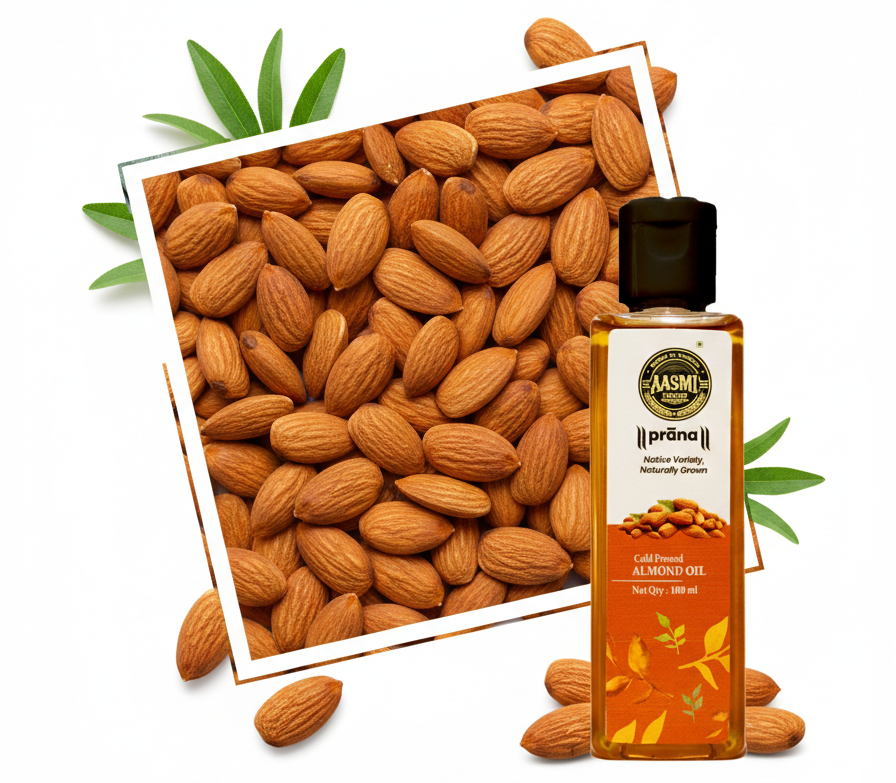 A light, nourishing almond oil cold-pressed from finest almonds, rich in Vitamin E, deeply moisturizing skin, strengthening hair, and supporting daily beauty, wellness, and traditional self-care rituals naturally.